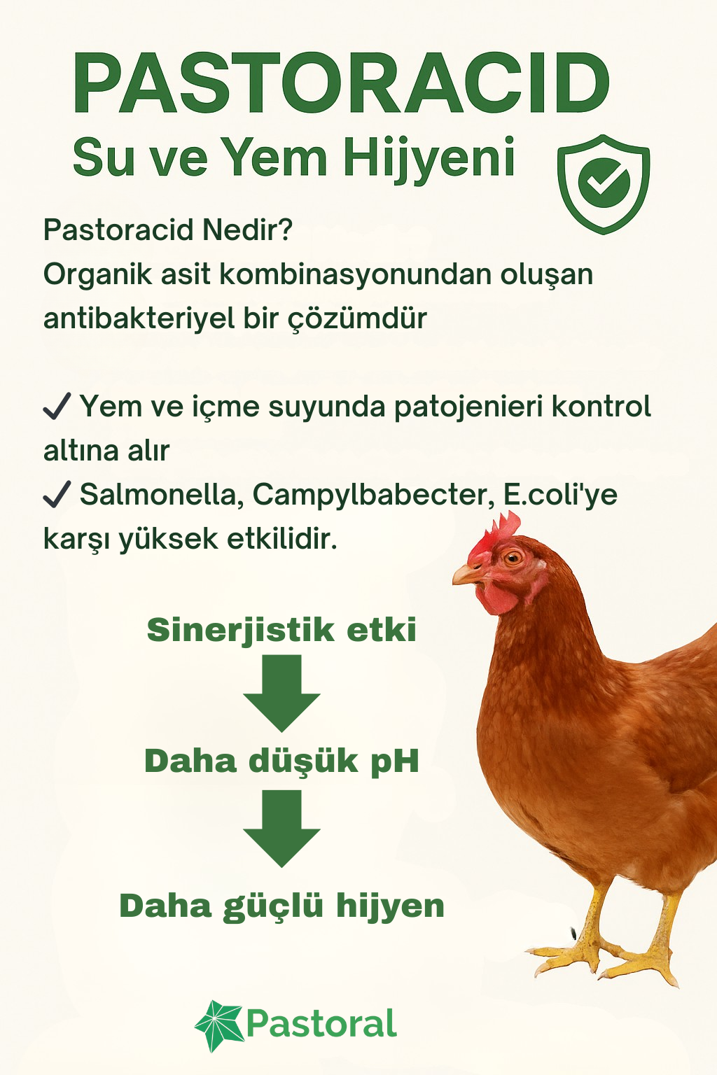 Pastoral Gıda tarafından geliştirilen Pastoracid, yem ve su kaynaklı bakteriyel kontaminasyonun kontrol altına alınması amacıyla formüle edilmiştir. İçeriğindeki saf organik asitlerin sinerjik etkisi sayesinde, tek bir asidin sağlayamayacağı düzeyde güçlü bir antibakteriyel etki sunar.