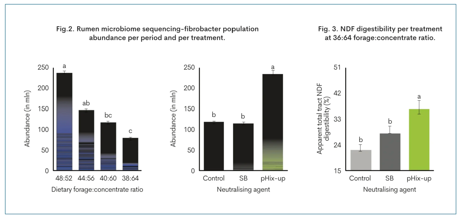 Bu mikrobiyal stabilite etkisi, Alex Bach ile yürütülen kontrollü bir çalışmada da doğrulanmıştır. Bu çalışmada SARA, rasyondaki nişasta oranı artırılarak ve kaba yem/konsantre oranı 36:64’e düşürülerek oluşturulmuştur. pHix-up, eşdeğer nötralizasyon kapasitesine sahip sodyum bikarbonat ile karşılaştırılmıştır. Sonuçlar, pHix-up’ın Fibrobacter succinogenes popülasyonunu koruduğunu ve asidik stres altında NDF sindirilebilirliğini artırdığını göstermiştir. Ayrıca Treponema gibi diğer önemli lif parçalayıcı mikroorganizmaları da desteklemiştir. Bu sonuçlar, pHix-up’ın yalnızca pH stabilizasyonu sağlamakla kalmayıp aynı zamanda yüksek konsantre besleme koşullarında rumen mikrobiyomunun fonksiyonel bütünlüğünü koruduğunu göstermektedir.