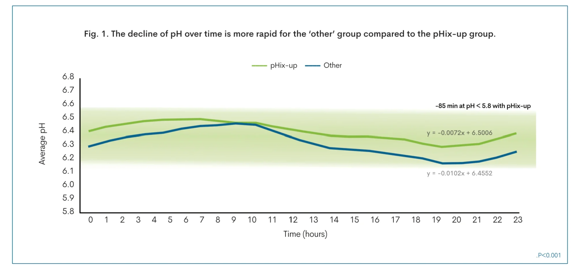Terresis Agriculture tarafından pHix-up’ın rumen pH’sı üzerindeki etkisini sodyum bikarbonat ve litotamniyum gibi yaygın nötralize edici ajanlarla karşılaştırmak için çeşitli denemeler yapılmıştır. Üç ay boyunca her 10 dakikada bir pH ölçümü yapan intraruminal boluslarla donatılmış 84 ineği içeren bir meta-analiz gerçekleştirilmiştir. Bu çalışma, ADSA 2025’te sunulmuş olup pHix-up’ın yerel koşullar ve besleme uygulamalarından bağımsız olarak rumen pH’sını istikrarlı şekilde stabilize ettiğini göstermiştir. pHix-up verilen ineklerin, kritik eşik olan pH 5.8’in altında geçirdikleri sürenin günlük 85 dakika daha az olduğu görülmüştür. Ayrıca gün içindeki pH değişimi, pHix-up’ın ani dalgalanmaları önleyerek daha stabil bir rumen ortamı sağladığını ortaya koymuştur.
